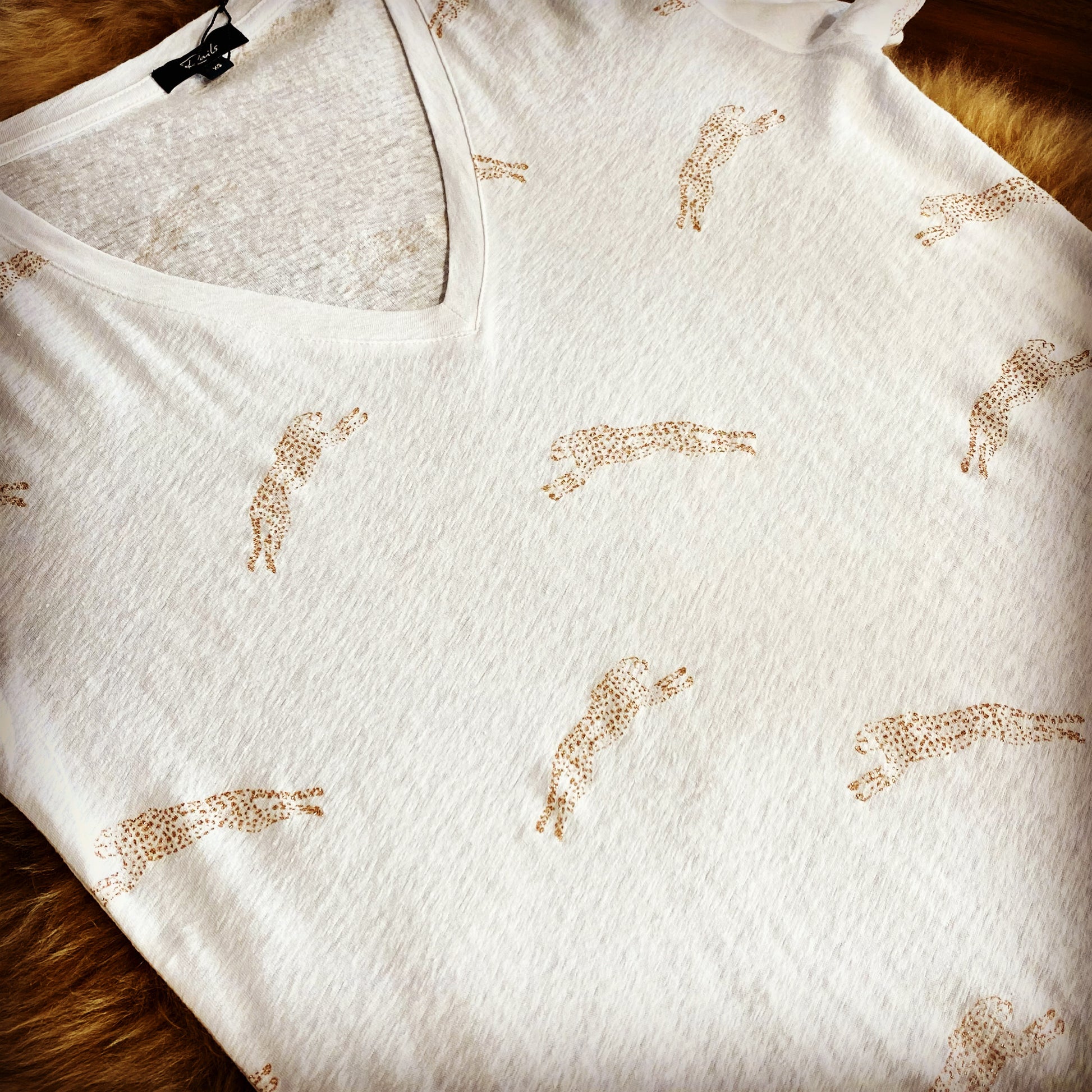Soft knit, short sleeve, V-neck printed top. Add some whimsy and a personal touch to this classic white tee with this fun conversational print. Great for layering.