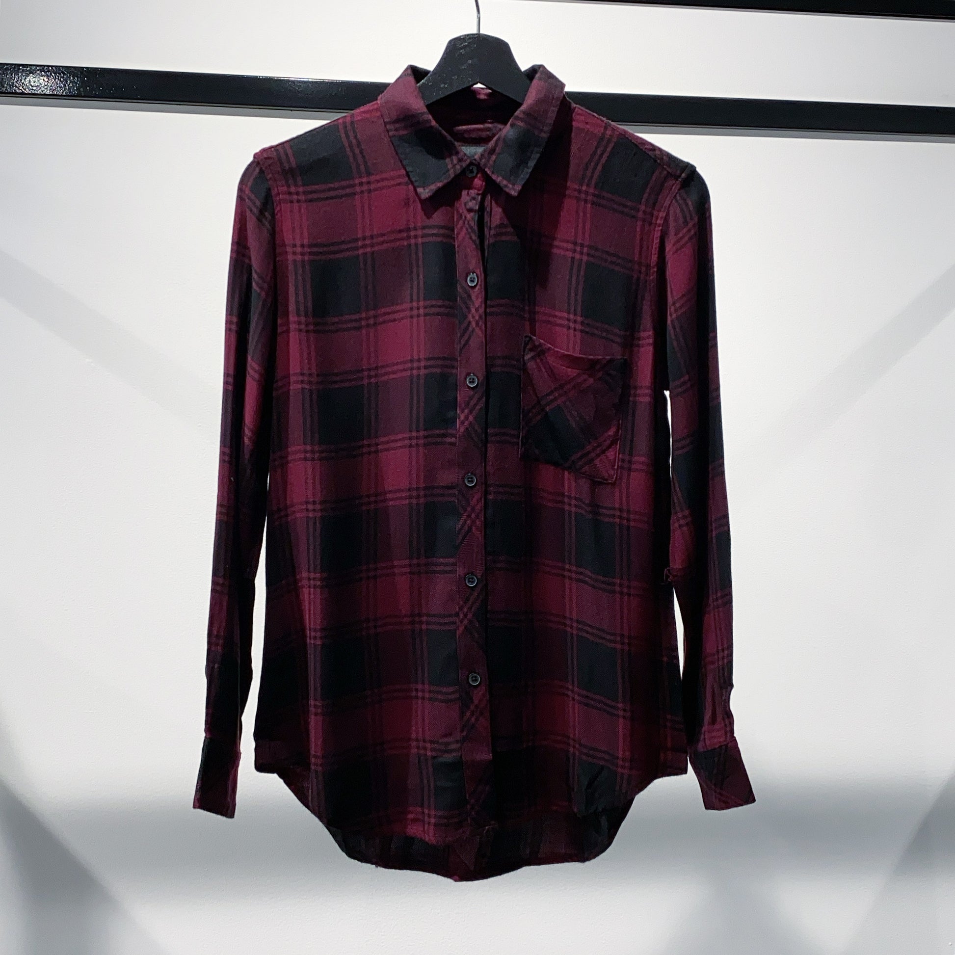 The classic RAILS long sleeve plaid buttondown shirt. Made from signature, ultra soft rayon fabric featuring a loose twill weave. This style is a year-round comfort classic with onyx black plaid on a cranberry red base.