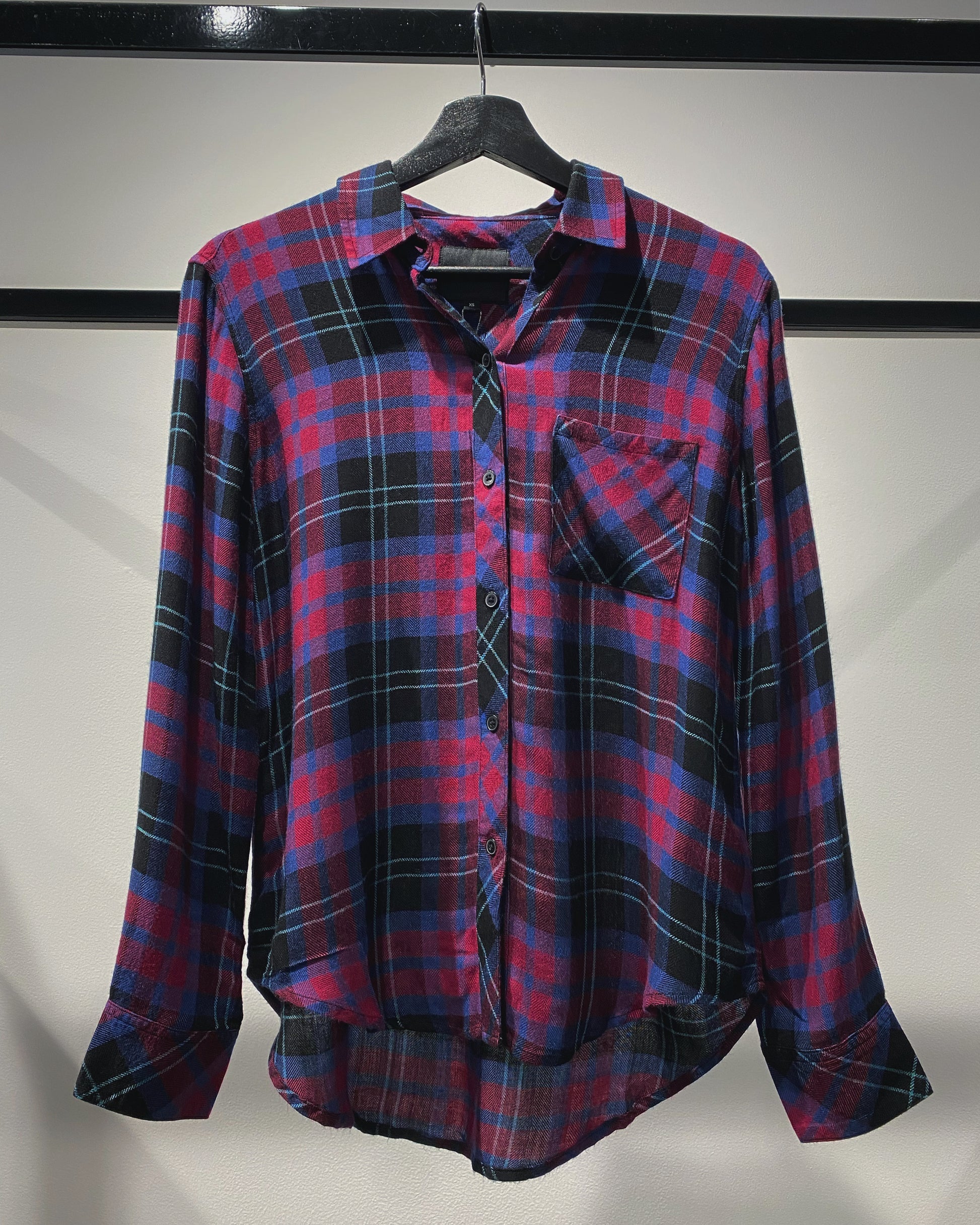 A classic long sleeve plaid button-down shirt. Made from Rails signature, ultra soft rayon fabric featuring a loose twill weave. This style is a year-round comfort classic with a turquoise, berry and navy plaid design on a scarlet base.