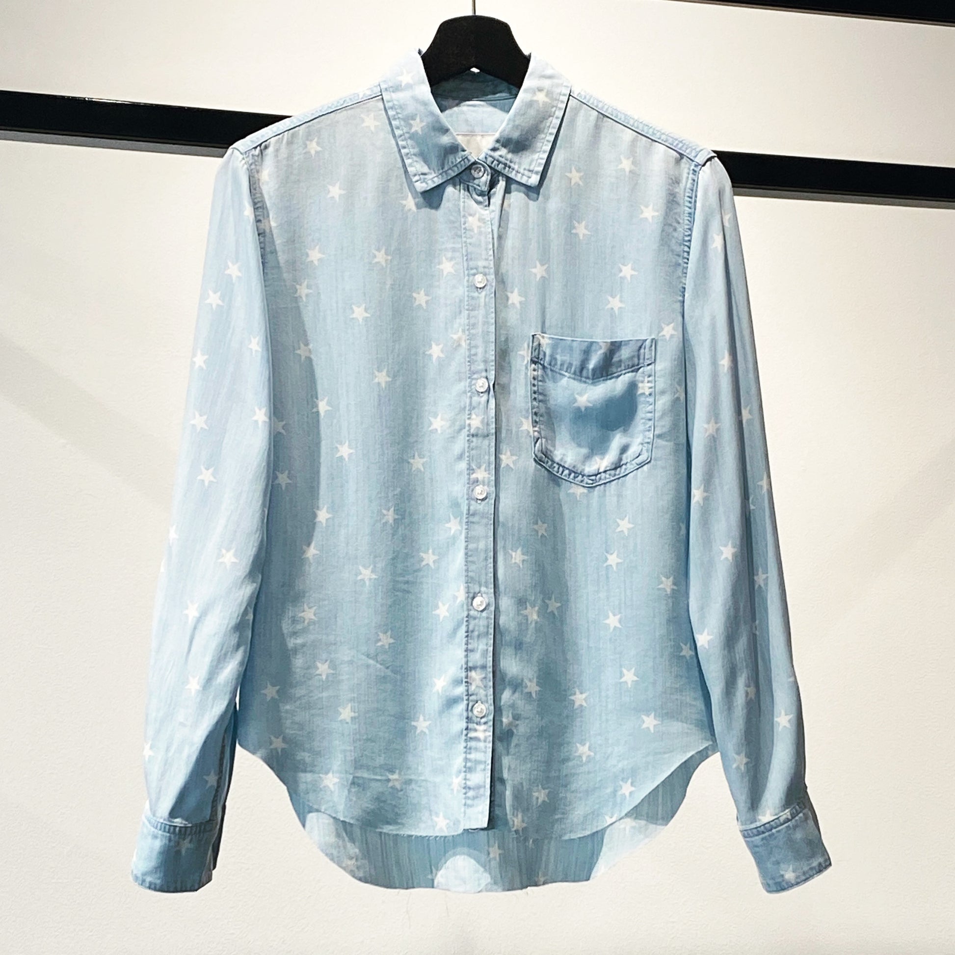 A super soft and lightweight take on the classic denim shirt. Featuring a bleached star print with a vintage wash finish, patch pocket at the chest, and a raw hem.